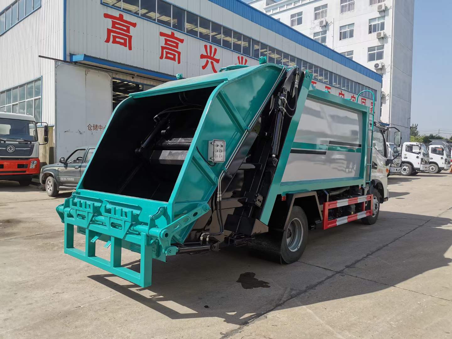 標(biāo)配:箱體滿焊,尾部帶照明燈,方便夜間操作使用。標(biāo)配240L掛桶翻轉(zhuǎn)機(jī)構(gòu)。